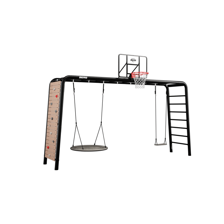 Ovaj set uključuje BERG PlayBase Extra Large konstrukciju, stijenu za penjanje, gnijezdo-ljuljačku, klasičnu ljuljačku i košarkaški koš – savršen izbor za obitelji koje žele maksimalnu raznolikost igre, kretanja i zabave. Zahvaljujući dodatnoj širini, nudi još više prostora za istovremenu i bezbrižnu igru više djece.